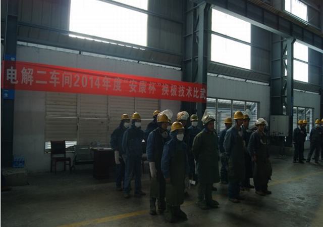 青海物產(chǎn)工業(yè)投資有限公司全面啟動(dòng)"安康杯"競(jìng)賽活動(dòng)。2014年4月15日上午電解二車間舉行了"安康杯"換極技術(shù)比武大賽。公司副總經(jīng)理張?jiān)手遥笨偨?jīng)理、工會(huì)主席張秉瑜,總經(jīng)理助理秦建峰出席了開幕式。