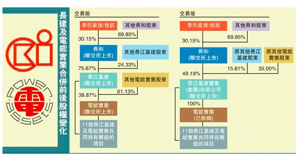 (下圖為長建及電能合并前后的股權(quán)變化,圖片來自香港《文匯報》)