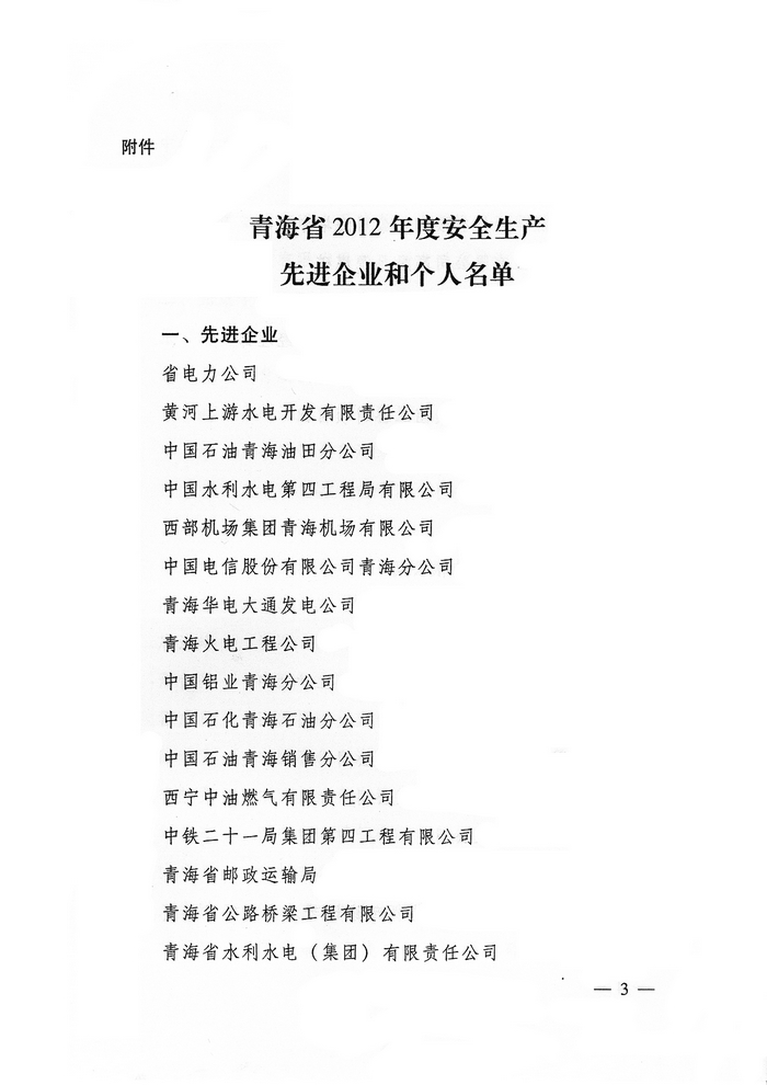 2012年,在省委、省政府的正確領(lǐng)導(dǎo)下,青海省物產(chǎn)集團(tuán)總公司認(rèn)真學(xué)習(xí)貫徹黨的十八大精神,全面貫徹落實科學(xué)發(fā)展觀,牢固樹立以人為本、安全發(fā)展的理念,深入開展"安全生產(chǎn)年"、"隱患排查治理"、"打非治違"等活動,為促進(jìn)全省安全生產(chǎn)形勢持續(xù)穩(wěn)定好轉(zhuǎn)做出了積極貢獻(xiàn)。為此,經(jīng)省政府同意,省安全生產(chǎn)委員會決定授予青海省物產(chǎn)集團(tuán)總公司"2012年度安全生產(chǎn)先進(jìn)企業(yè)"榮譽稱號。